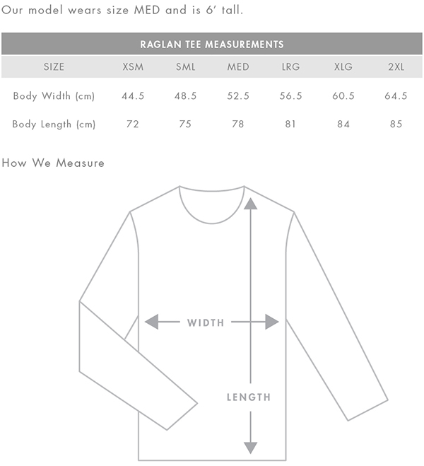 Crew neck, ¾ length raglan sleeves, curved tails